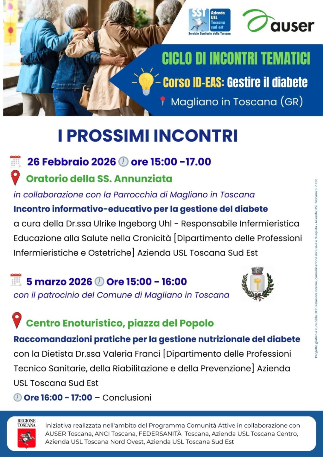 Magliano in Toscana: Conoscere, prevenire e gestire: sono queste le parole chiave dei due appuntamenti formativi dedicati al diabete che si terranno a Magliano in Toscana. L’iniziativa del Corso Id-Eas è rivolta alla cittadinanza per favorire una gestione consapevole di questa patologia cronica.