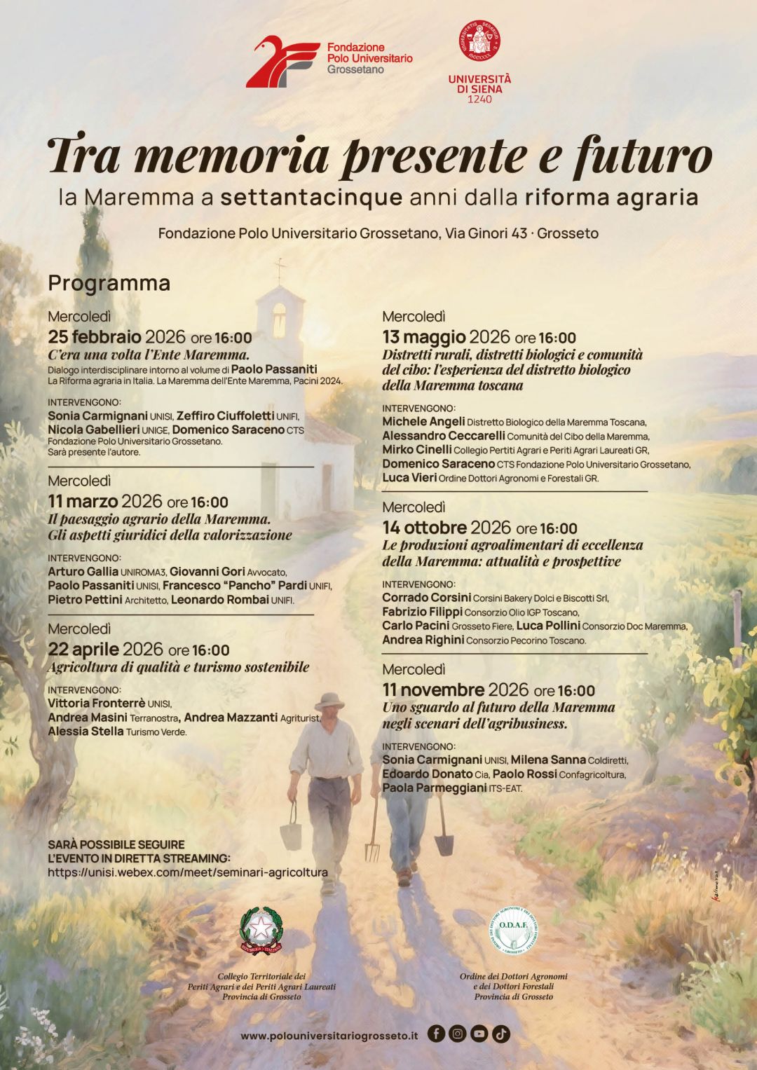 Oltre al ciclo di conferenze Tra memoria presente e futuro per il 2026 sono in programma altri eventi organizzati in collaborazione con i professionisti agrari sulle novità introdotte dal DM 323051/2024 sulle nuove non conformità in agricoltura biologica, sull’obbligo imminente per le aziende agricole della tenuta del quaderno di campagna e sui problemi fitosanitari dei vigneti in provincia di Grosseto, mentre in collaborazione con i Georgofili è prevista una giornata di studio sul credito agrario e le problematiche finanziarie delle piccole aziende ed una sulle criticità produttive ed ambientali della laguna di Orbetello.