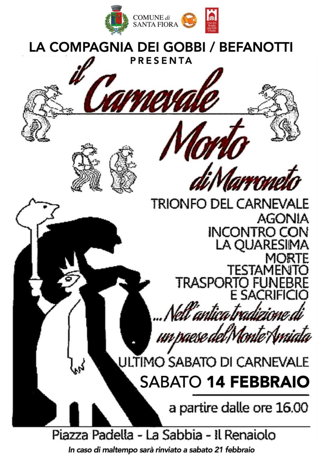 Santa Fiora: Il carnevale viene celebrato in modo originale e divertente a Marroneto, frazione di Santa Fiora, con un goliardico corteo funebre: sabato 14 febbraio, alle ore 16, torna in piazza Padella il “Carnevale Morto” di Marroneto, che segna la fine dei festeggiamenti del carnevale e l’inizio della Quaresima.