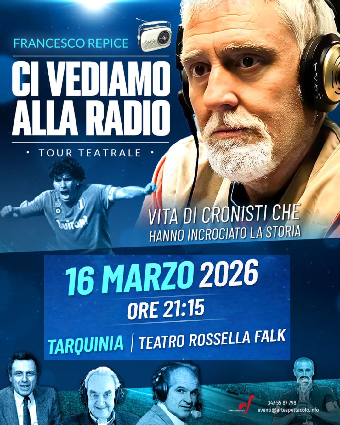 Tarquinia: Il 16 marzo 2026 torna a Tarquinia il premio “Cavalli Alati – Sulle ali dello sport”, giunto alla sua seconda edizione. Tra i protagonisti dell’evento anche il radiocronista Francesco Repice, storica voce di "Tutto il Calcio minuto per minuto", che la sera porterà in scena al teatro “Rossella Falk” lo spettacolo “Ci vediamo alla radio - Vite di cronisti che hanno incrociato la Storia”. Promosso dalla Pro loco Tarquinia, in collaborazione con il AIAC Viterbo (Associazione Italiana Allenatori di Calcio – Gruppo provinciale di Viterbo) e con il patrocinio del Comune di Tarquinia, il riconoscimento celebra le eccellenze italiane che, attraverso il proprio impegno, promuovono i valori fondamentali dello sport, in particolare il rispetto delle regole e l’importanza dell’aggregazione sociale.