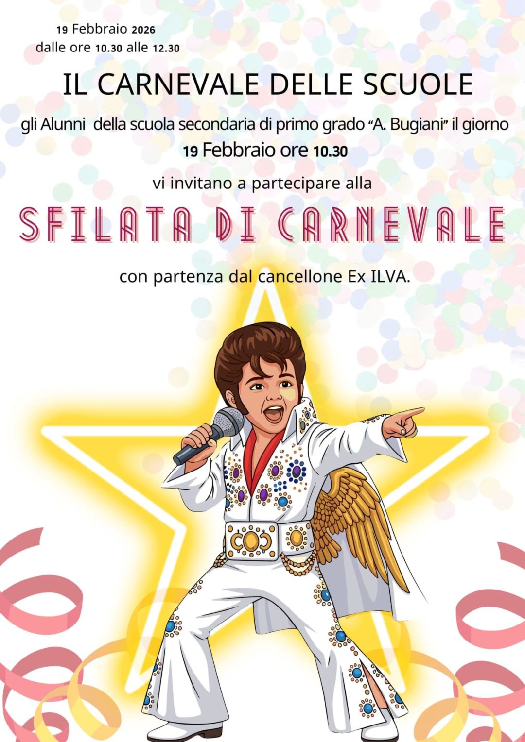 Omaggio a Elvis Presley: Un tuffo nel mito del Rock’n’Roll. Il carro sarà una vera esplosione di energia, arricchito da una performance dal vivo: un alunno delle classi terze interpreterà tre dei brani più iconici del "Re del Rock", accompagnando la sfilata con musica e coreografie curate dai ragazzi stessi.