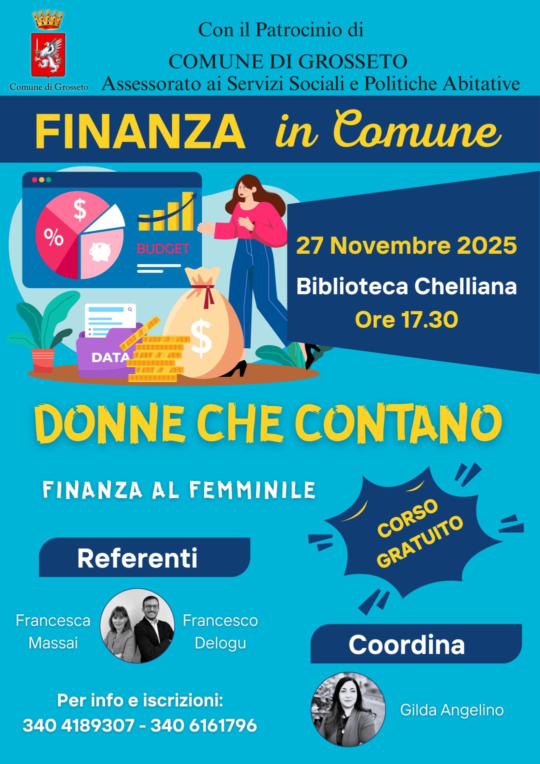 Grosseto: Si terrà mercoledì 27 novembre 2025, alle ore 17.30 presso la biblioteca Chelliana di Grosseto, l'iniziativa gratuita dal titolo "Donne che contano: finanza al femminile", un evento organizzato con il Patrocinio del Comune di Grosseto, assessorato ai Servizi sociali e politiche abitative. Inserito nell’ambito progetto "Finanza in Comune", l'incontro è pensato per fornire strumenti pratici e conoscenze utili per affrontare le sfide economiche della vita moderna. L’iniziativa, in particolare, mira a colmare il divario di genere in ambito economico, affrontando in modo diretto e pratico i seguenti argomenti: