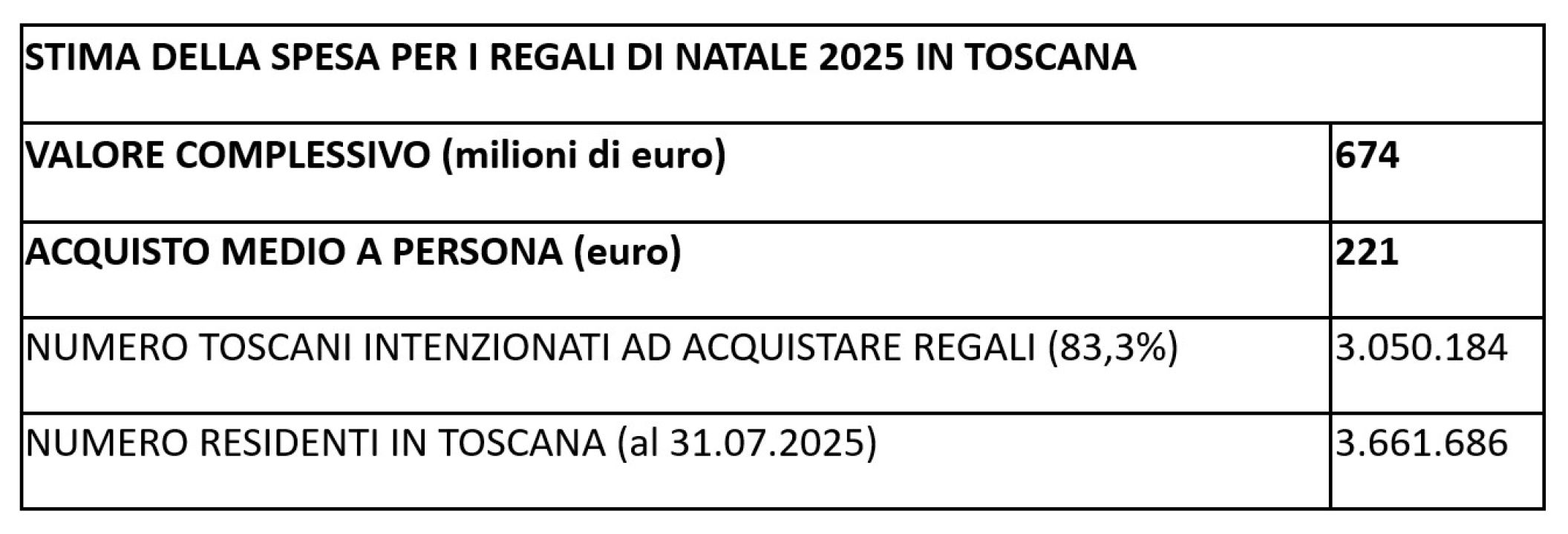 Firenze: Aumenta, seppur di poco, la propensione dei toscani agli acquisti natalizi: l’83,3% (contro l’82,3 del 2024 e il 74,5% del 2023) si dichiara pronto a comprare qualcosa da regalare, sia nei negozi fisici sia online. E continua a crescere anche il budget medio di spesa: 221 euro pro capite (contro i 213 del 2024 e i 195 del 2023) per un volume complessivo di affari quantificabile in almeno 674 milioni di euro.