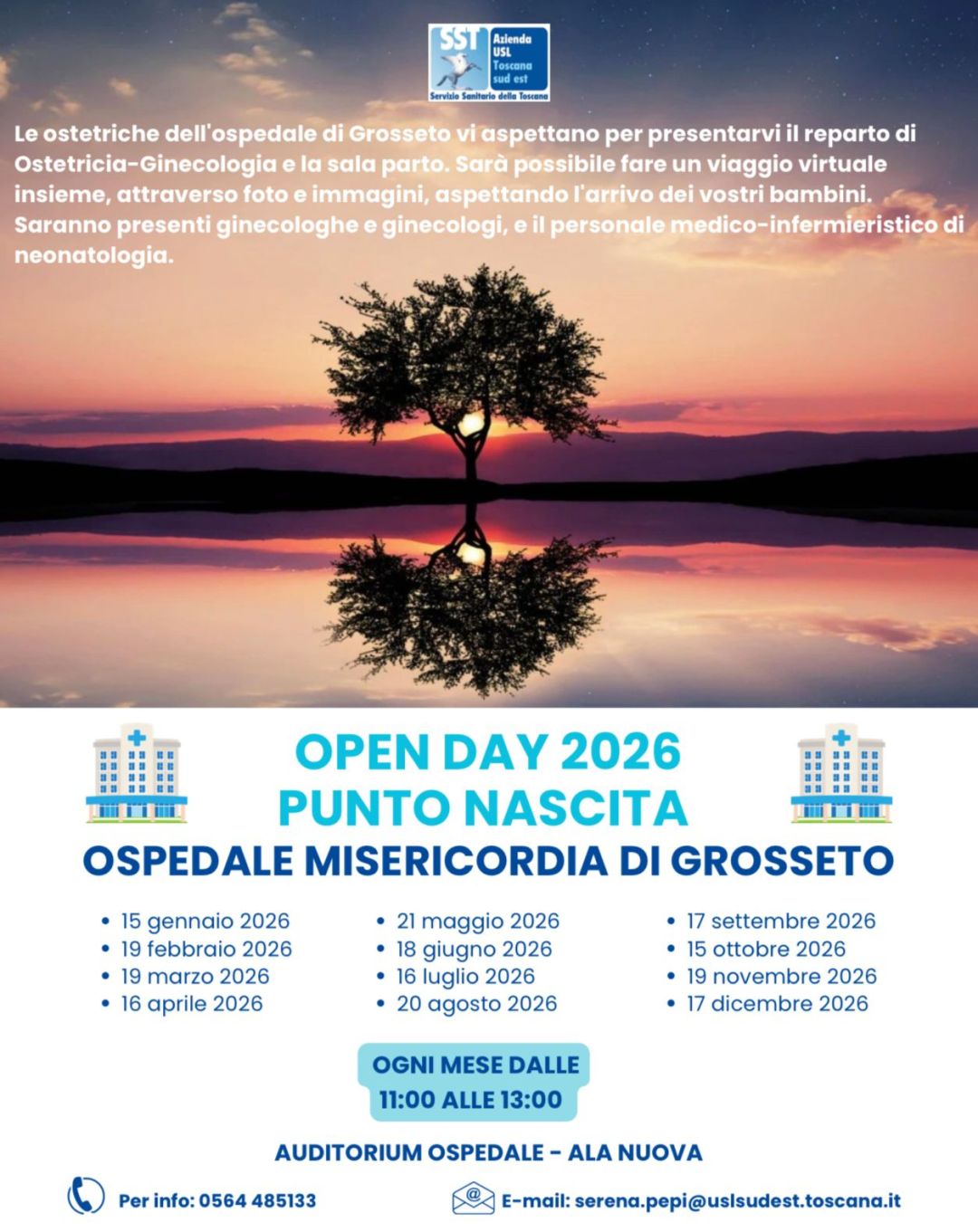 Grosseto: Si terrà giovedì 15 gennaio il primo appuntamento del 2026 per scoprire i servizi offerti dal punto nascita di Grosseto. Gli incontri si tengono dalle 11 alle 13 nell’auditorium della nuova ala dell'Ospedale e sono organizzati dalle ostetriche con la partecipazione delle ginecologhe, dei neonatologi e degli infermieri della Terapia intensiva neonatale del Misericordia. L’obiettivo è quello di far conoscere il percorso che va dalla rete dei consultori, fino al punto nascita di Grosseto.