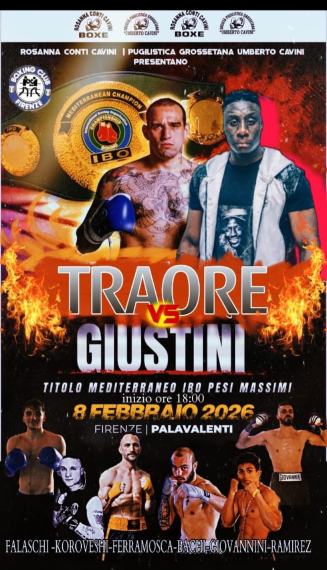 Grosseto: Ci siamo quasi. L’attesa sta per terminare e il primo grande evento del 2026 targato Rosanna Conti Cavini è ormai in dirittura d’arrivo. Domenica 8 febbraio, infatti, è in programma un grande evento sportivo al PalaValenti di Firenze. Il clou della riunione è incentrato sul titolo Mediterraneo IBO dei pesi massimi, sulla distanza delle dieci riprese. A salire sul ring il pugile di casa, appartenente al team RCC Boxe, Eduardo Giustini che incrocerà i guantoni con il francese Ibrahim Traoré. Si tratta di un match molto interessante, che promette spettacolo e tanta incertezza, quest’ultima dettata anche dagli imprevisti di percorso che hanno costretto la promoter internazionale Rosanna Conti Cavini, e tutto il suo staff, a un lavoro straordinario.