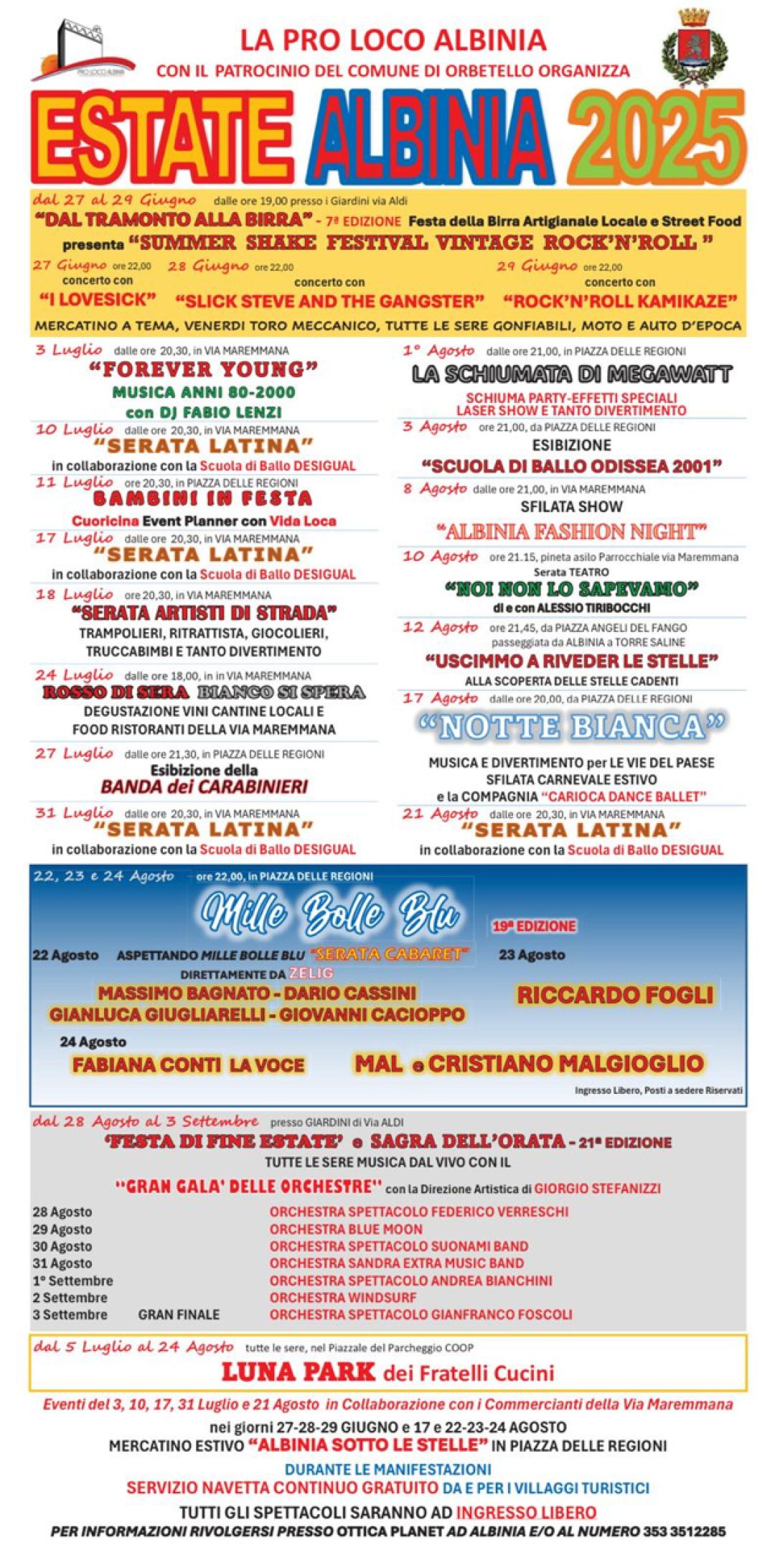 Dal 27 giugno al 3 settembre, Albinia sarà animata da concerti, spettacoli, manifestazioni culturali, eventi gastronomici e attività per tutte le età. Il calendario dell’ “Estate Albinia 2025” si conferma tra i più dinamici e partecipati della costa toscana, offrendo ogni sera un motivo per vivere il paese in festa.