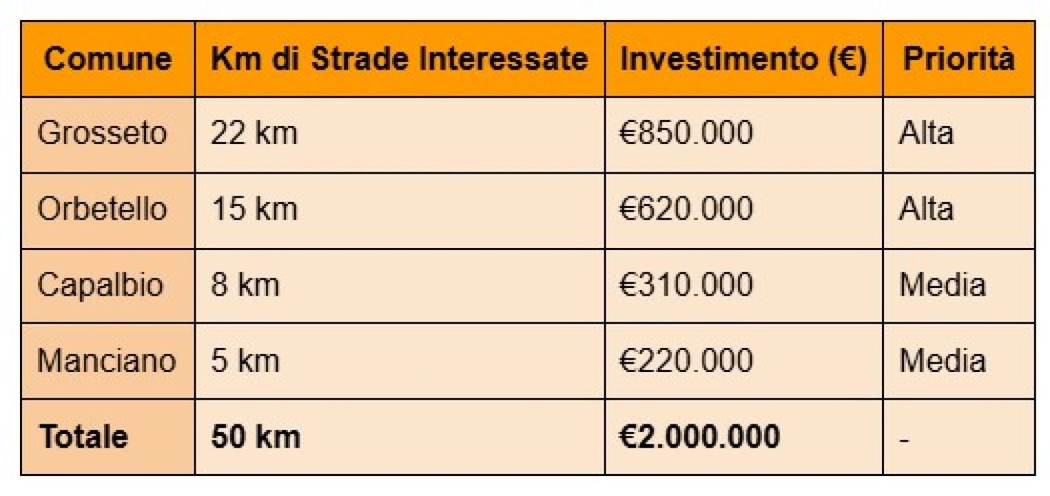 Gli interventi riguarderanno oltre 50 chilometri di strade rurali nei comuni di Grosseto, Orbetello, Capalbio e Manciano. Priorità sarà data alle arterie che collegano l'entroterra con la costa e alle strade utilizzate dalle aziende agricole.