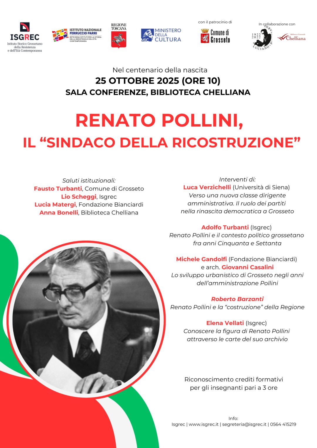 Dopo i saluti istituzionali di Fausto Turbanti (Comune di Grosseto), Lio Scheggi (Isgrec), Lucia Matergi (Fondazione Bianciardi), Anna Bonelli (Biblioteca Chelliana), seguiranno gli interventi di Luca Verzichelli (Università di Siena), “Verso una nuova classe dirigente amministrativa. Il ruolo dei partiti nella rinascita democratica a Grosseto”; Adolfo Turbanti (Isgrec), “Renato Pollini e il contesto politico grossetano fra anni Cinquanta e Settanta”; Michele Gandolfi (Fondazione Bianciardi) e l’arch. Giovanni Casalini, “Lo sviluppo urbanistico di Grosseto negli anni dell’amministrazione Pollini”; Elena Vellati (Isgrec), “Conoscere la figura di Renato Pollini attraverso le carte del suo archivio”; Roberto Barzanti, “Renato Pollini e la ‘costruzione’ della Regione”.